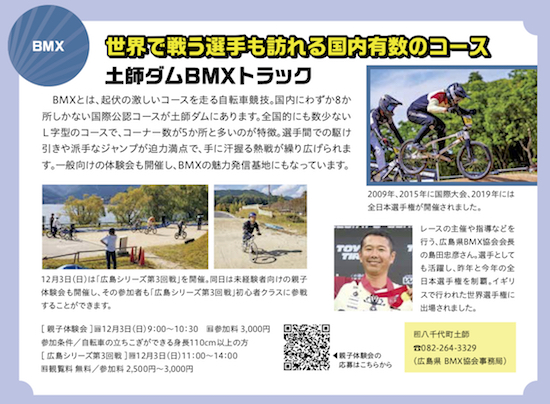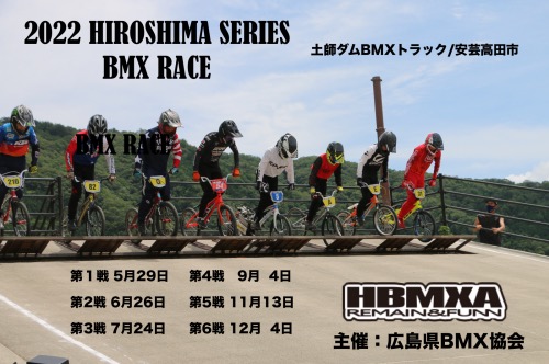 2022 広島シリーズ BMXレース 2022 広島シリーズの日程が決まりました。 詳細につきましては大会が近づき次第、お伝えします。 子供から大人まで楽しめるレースを目指します。 土師ダムBMXトラック/安芸高田市 のど声...