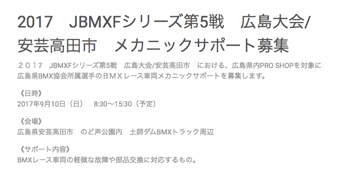 2017 JBMXFシリーズ第5戦 広島大会における、広島県内のPRO SHOPを対象に広島県BMX協会所属選手のメカニックサポートを募集します。
