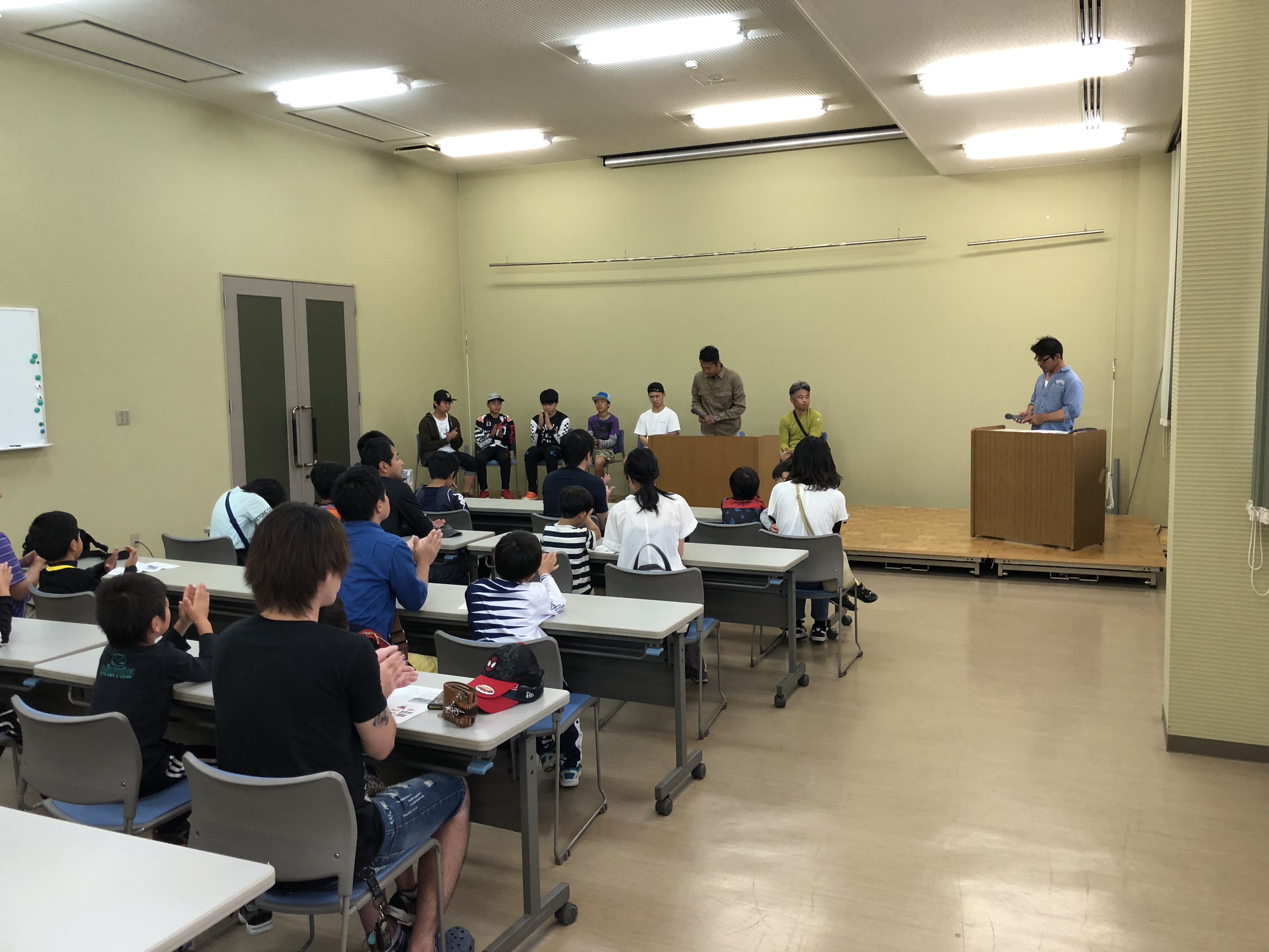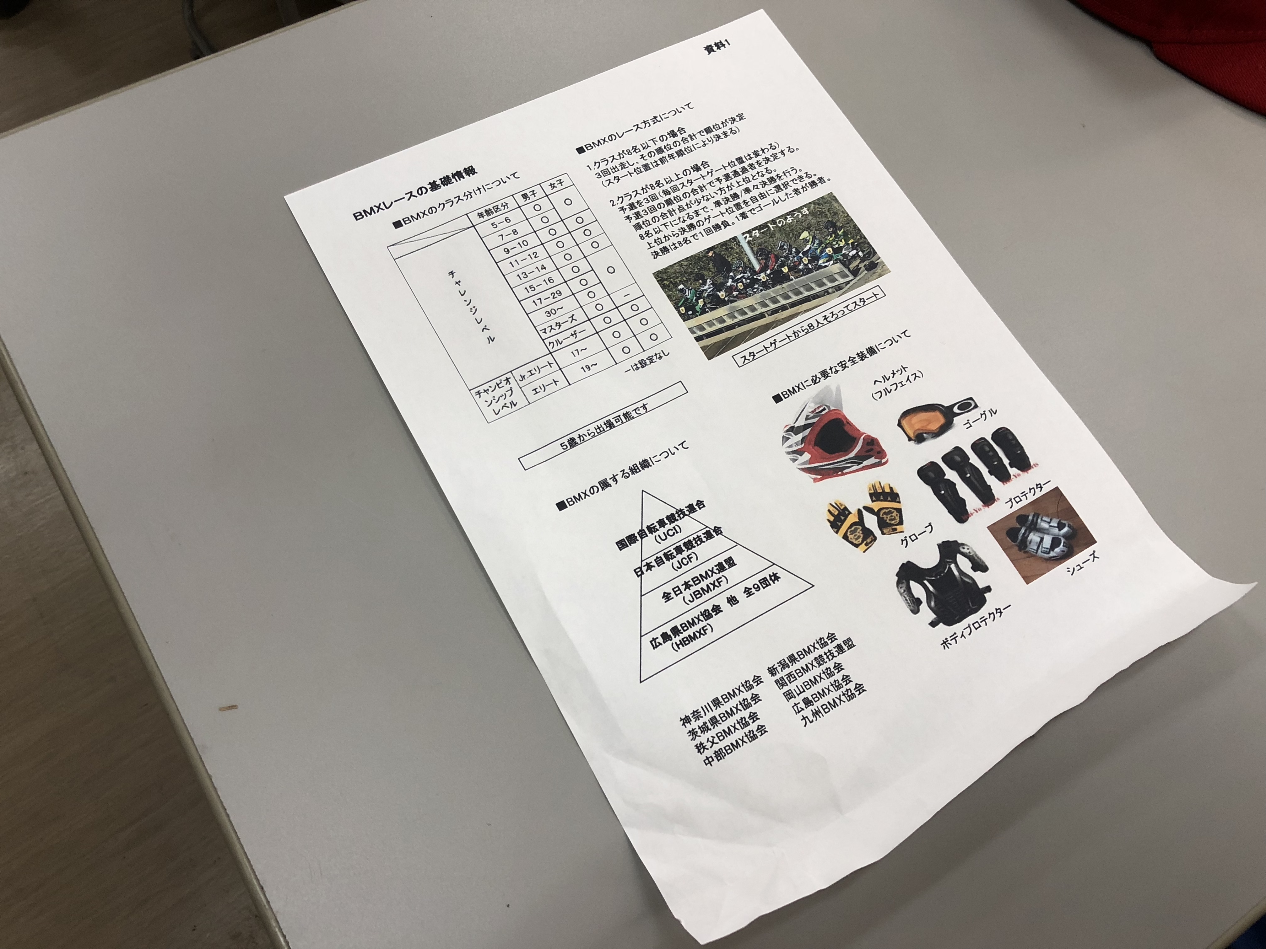 開校にあたり、BMXレースの基礎知識、トラック走行における注意事項、安全装備等の説明を受けました。早く走りたい気持ちもありますが、みなさん、座学で基本的なことを真剣に聞かれていました。